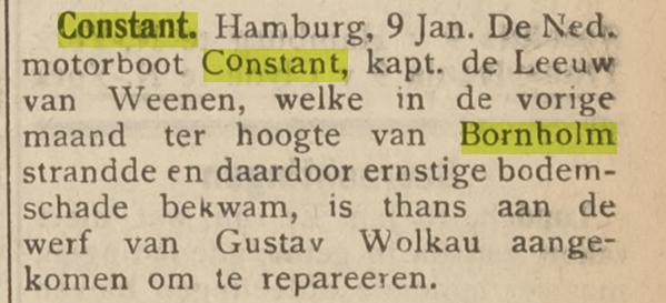 De Constant, geladen met vaten olie, is onderweg van Hamburg naar Stockholm bij Bornholm gestrand. Na het lossen van 40 ton vaten is het schip weer vlot gekomen.