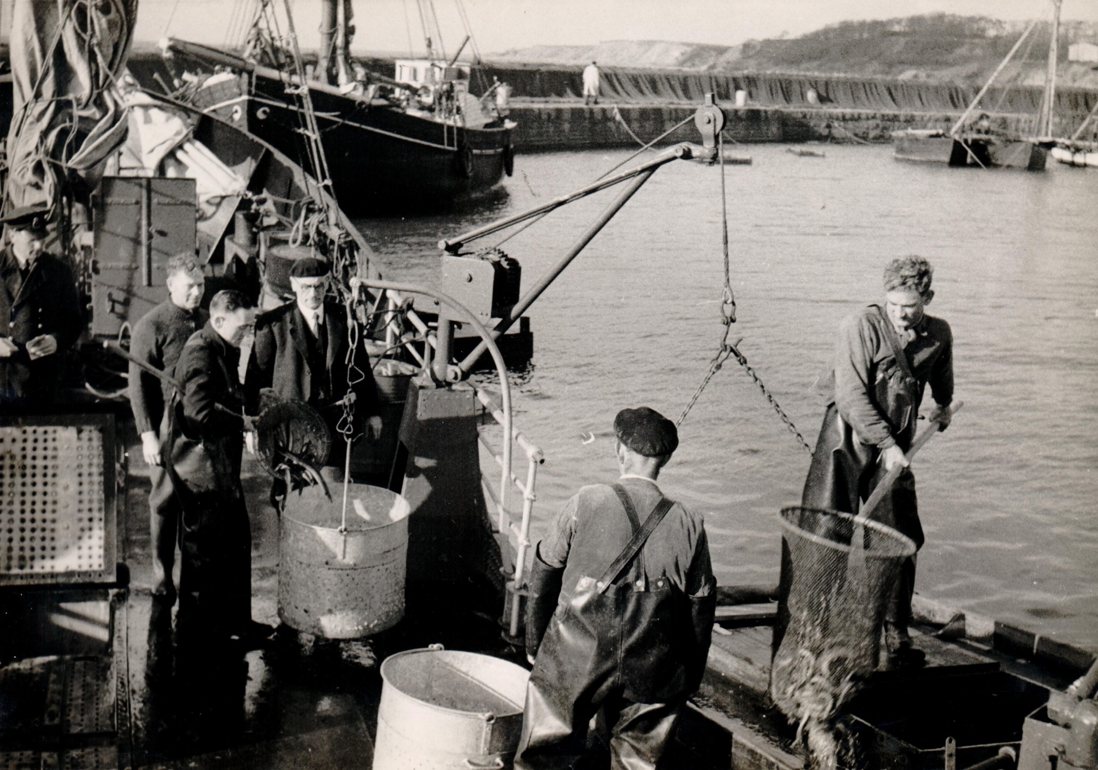 Paling laden met de Helene in de haven van Raa, Zweden. Links bij de weegschaal: Henk dLvW, Frits Kuijten en de ‘oude heer’ Kuijten (foto van het Helsingborgs Dagblad)